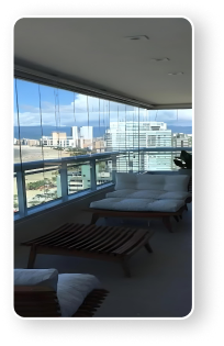 Fechamento de varandas com vidro temperado ou laminado. Estética moderna, redução de ruído e valorização imediata do imóvel. Sistema 100% sob medida, com perfis em alumínio de pintura eletrostática.